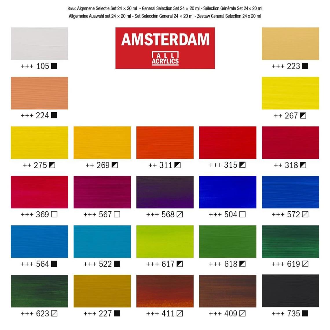 Contenu : 24 tubes de 20 ml (105 Blanc Titane – 223 Jaune de Naples foncé – 224 Jaune de Naples rouge – 267 Jaune azo citron – 275 Jaune primaire – 269 Jaune azo moyen – 311 Vermillion – 315 Rouge pyrrole – 318 Carmin – 369 Magenta primaire – 567 Violet rougeâtre permanent – 568 Violet bleuâtre permanent – 504 Outremer – 572 Cyan primaire – 564 Bleu brillant – 522 Bleu turquoise – 617 Vert jaunâtre – 618 Vert clair permanent – 619 Vert foncé permanent – 623 Vert de vessie – 227 Ocre jaune – 411 Terre de Sienne brûlée – 409 Terre d’ombre brûlée – 735 Noir oxyde).